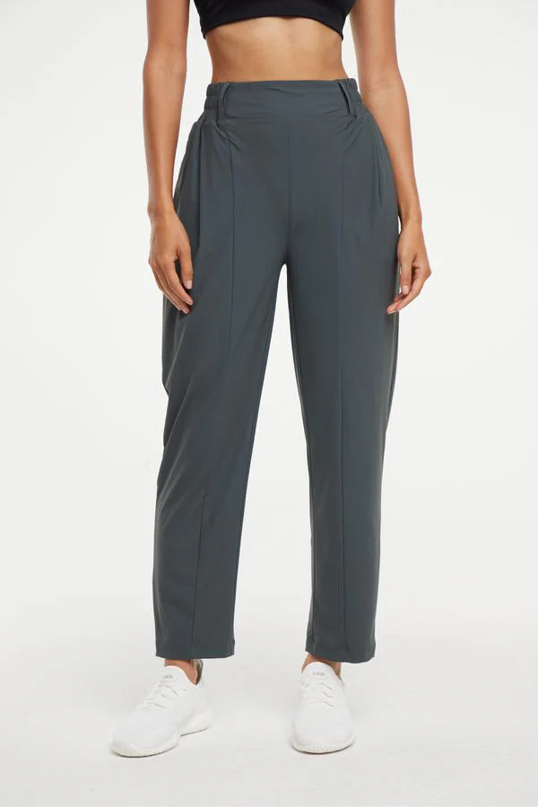 Move with ease in these lightweight, relaxed-fit pants featuring a high-rise elastic waistband, front pleats, and side zipper pockets. Perfect for warmups, cool-downs, or everyday comfort with sporty-chic style.